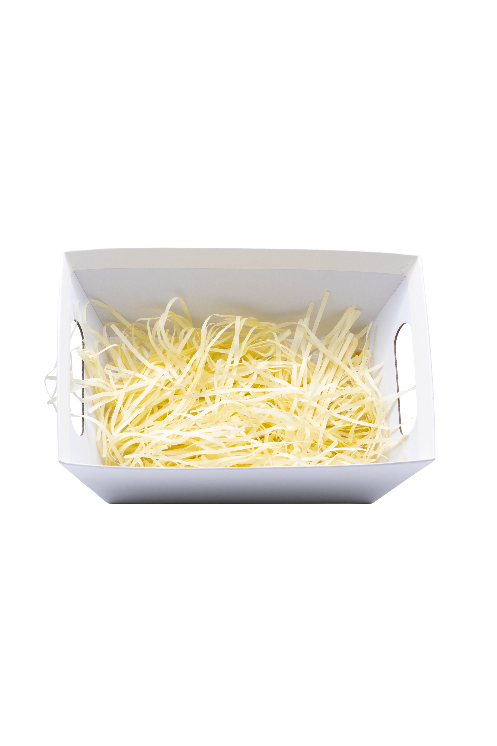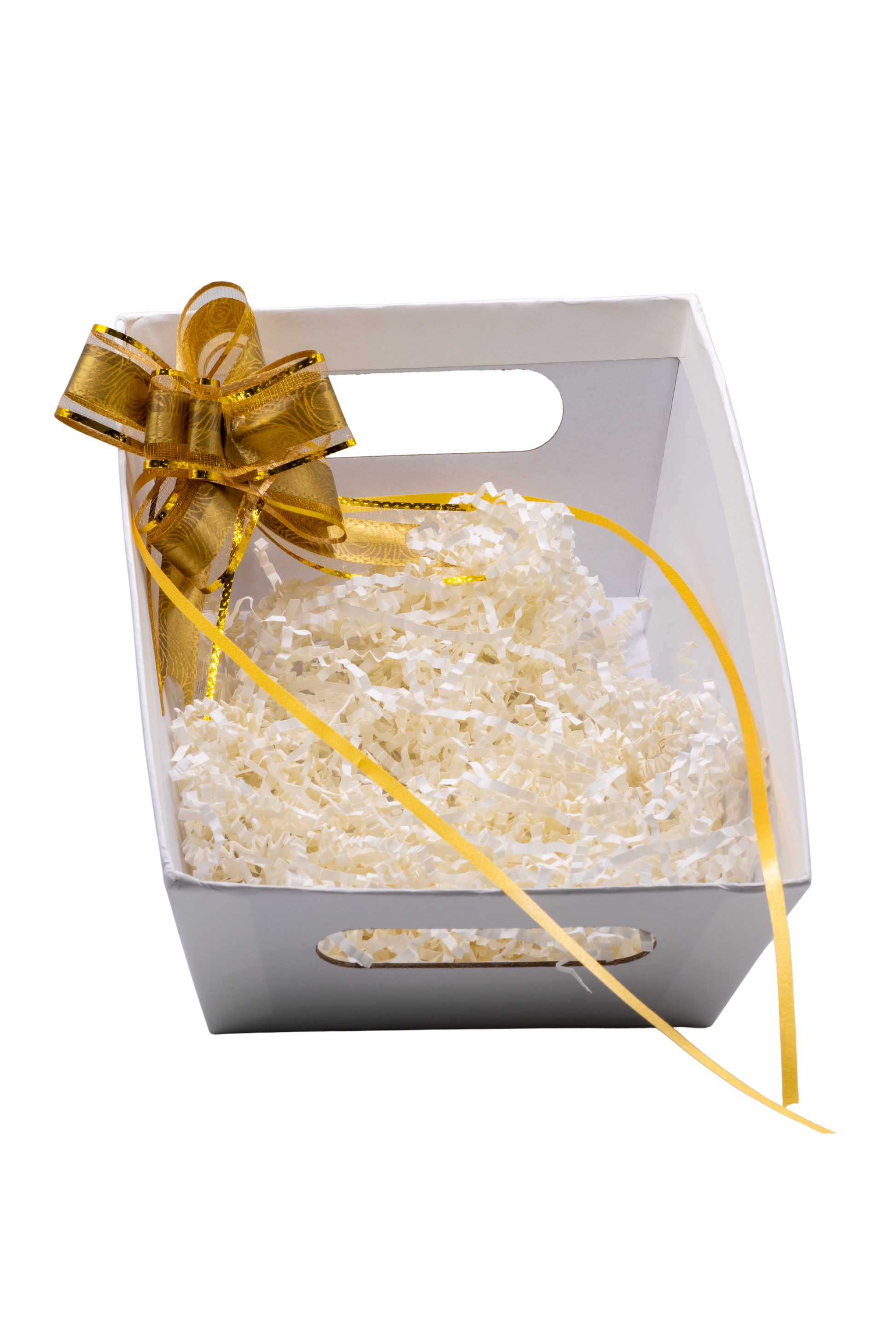 A caixa segue já montada e pronta a usar, para facilitar a montagem do cabaz. O celofane e o laço são enviados à parte, mas já cortados e preparados, para que possas montar o presente sem complicações. Não precisas de ferramentas nem fita-cola extra, basta colocar os produtos, envolver com o celofane e atar o laço.
