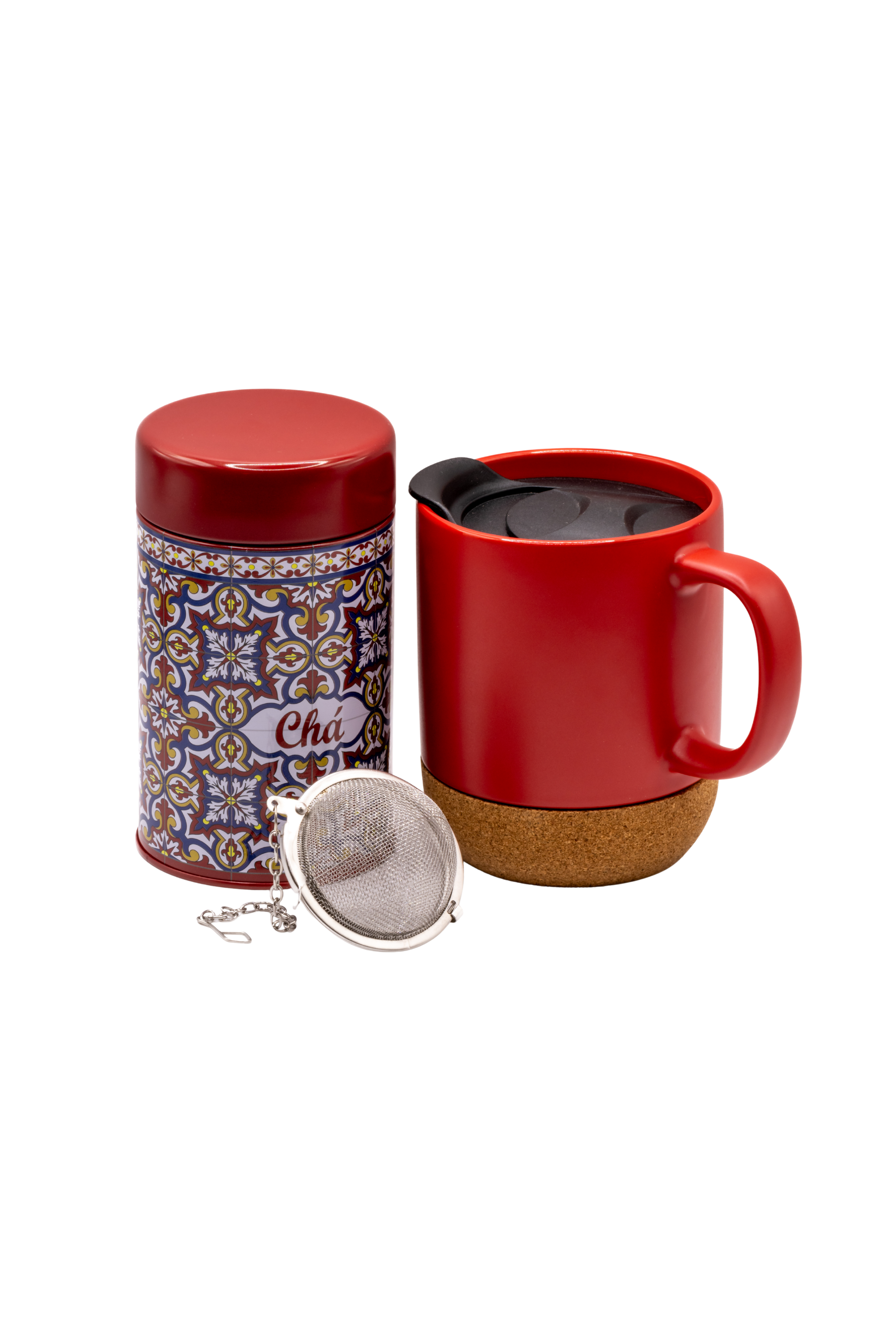 Sim, a caneca vermelha com base de cortiça e tampa está incluída no kit, tal como o infusor metálico reutilizável. Estes acessórios não são apenas decorativos — foram escolhidos para preservar melhor o calor da bebida e facilitar a preparação diária. A tampa também permite usar a caneca em movimento, tornando este kit prático e bonito.