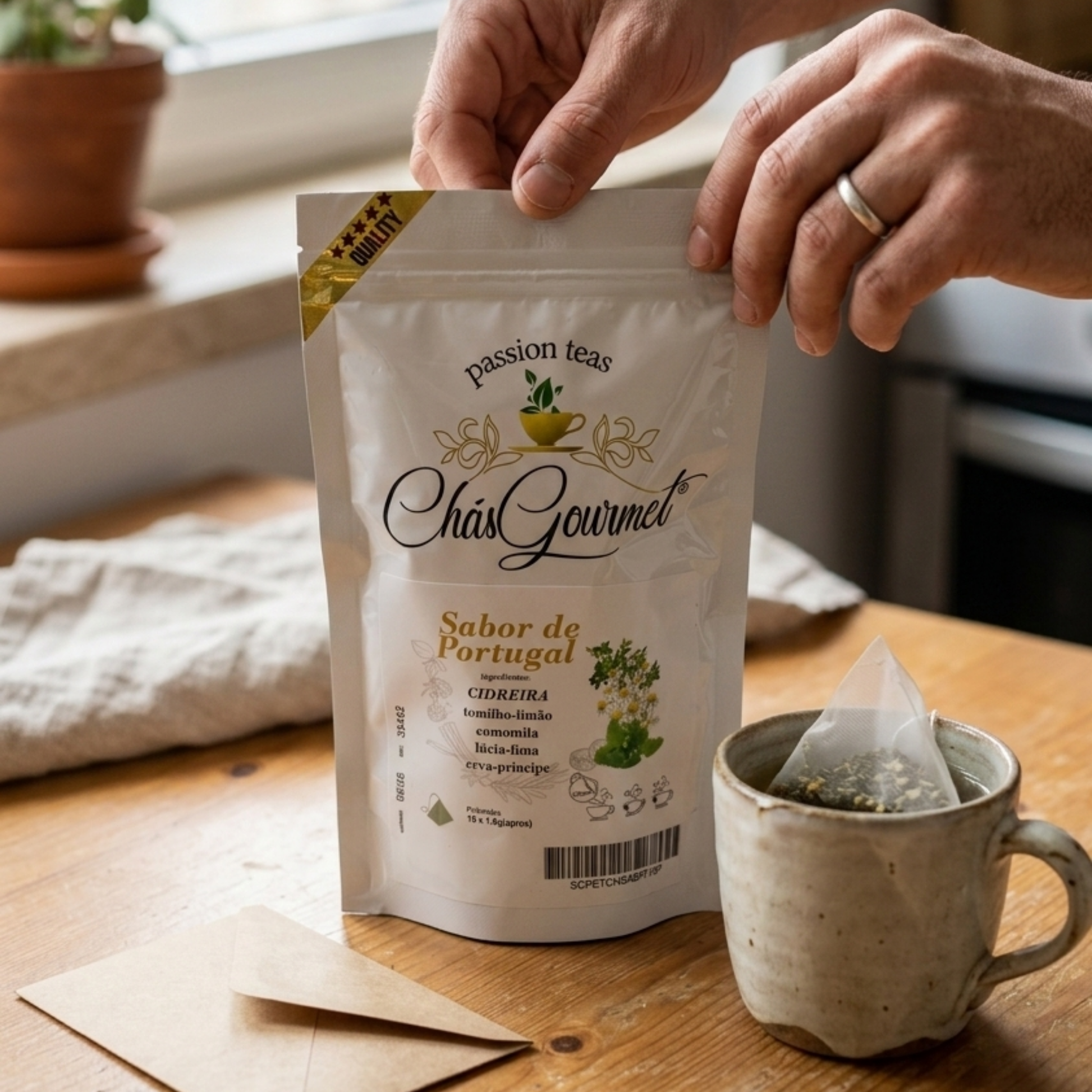 A Tisana Sabor de Portugal combina o aroma suave das plantas portuguesas com o equilíbrio natural entre frescura e conforto. Um blend harmonioso que desperta os sentidos e acalma a mente, inspirado nos sabores autênticos do nosso território.