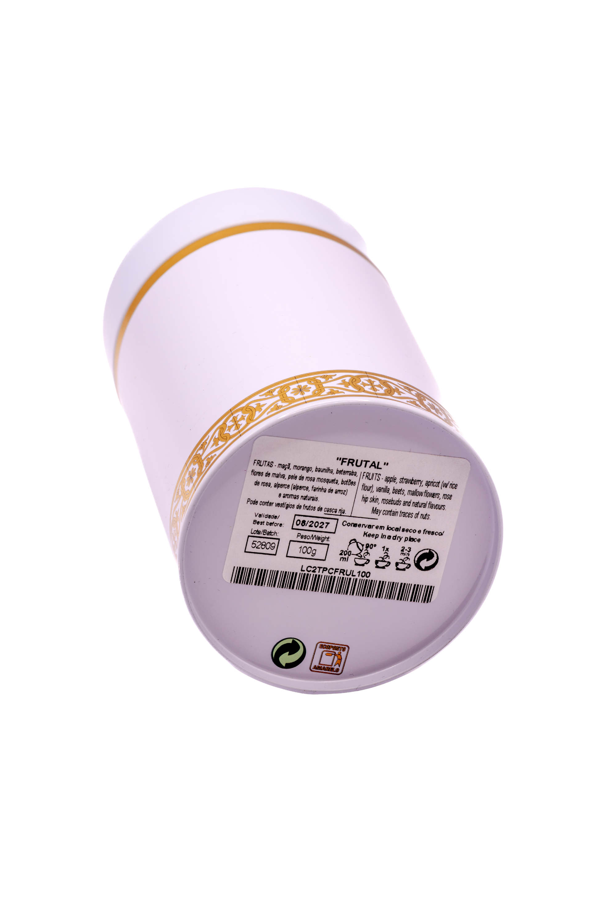 Manter em local fresco (máx. 20 °C), seco (máx. 60% de humidade) e ao abrigo da luz. Lata metálica com tampa dupla que protege o aroma e preserva a frescura das frutas e flores.
