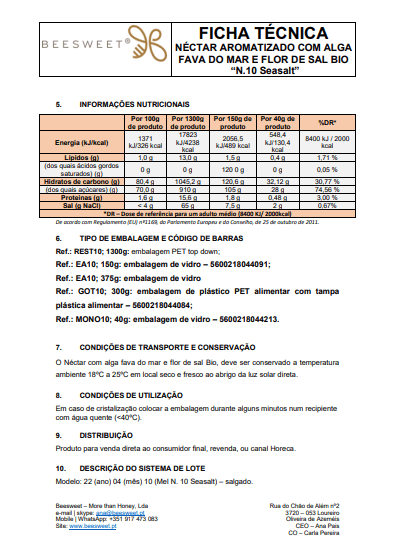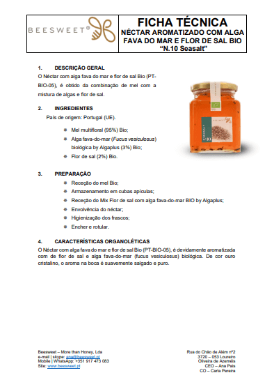 Ingredientes: Mel multifloral biológico 100% português, flor de sal, alga fava-do-mar (Fucus vesiculosus) biológica Peso líquido: 375g Certificação: PT-BIO-05