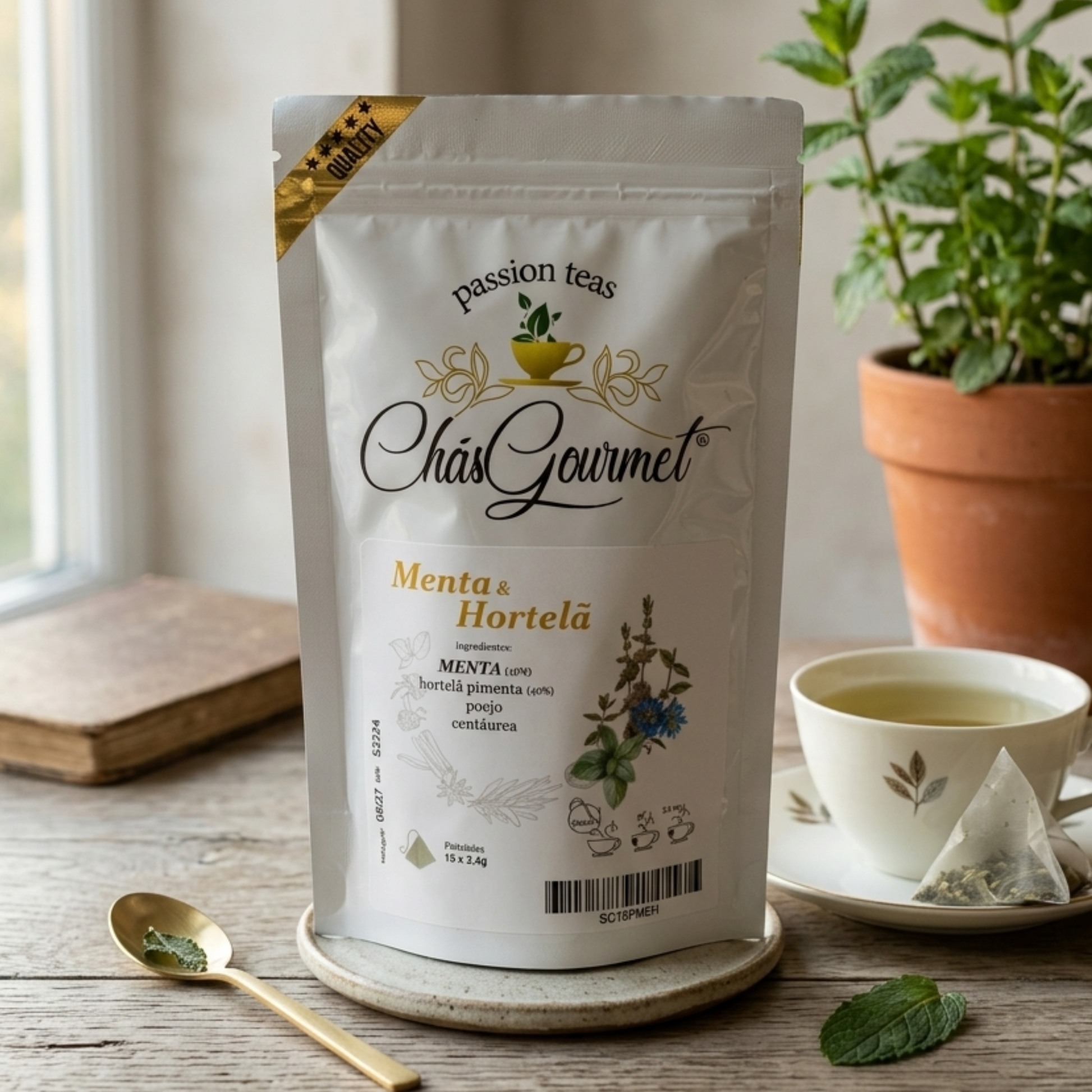 Ingredientes: Menta (40%), Hortelã‑pimenta (40%), Poejo, Centáurea – 15 Pirâmides