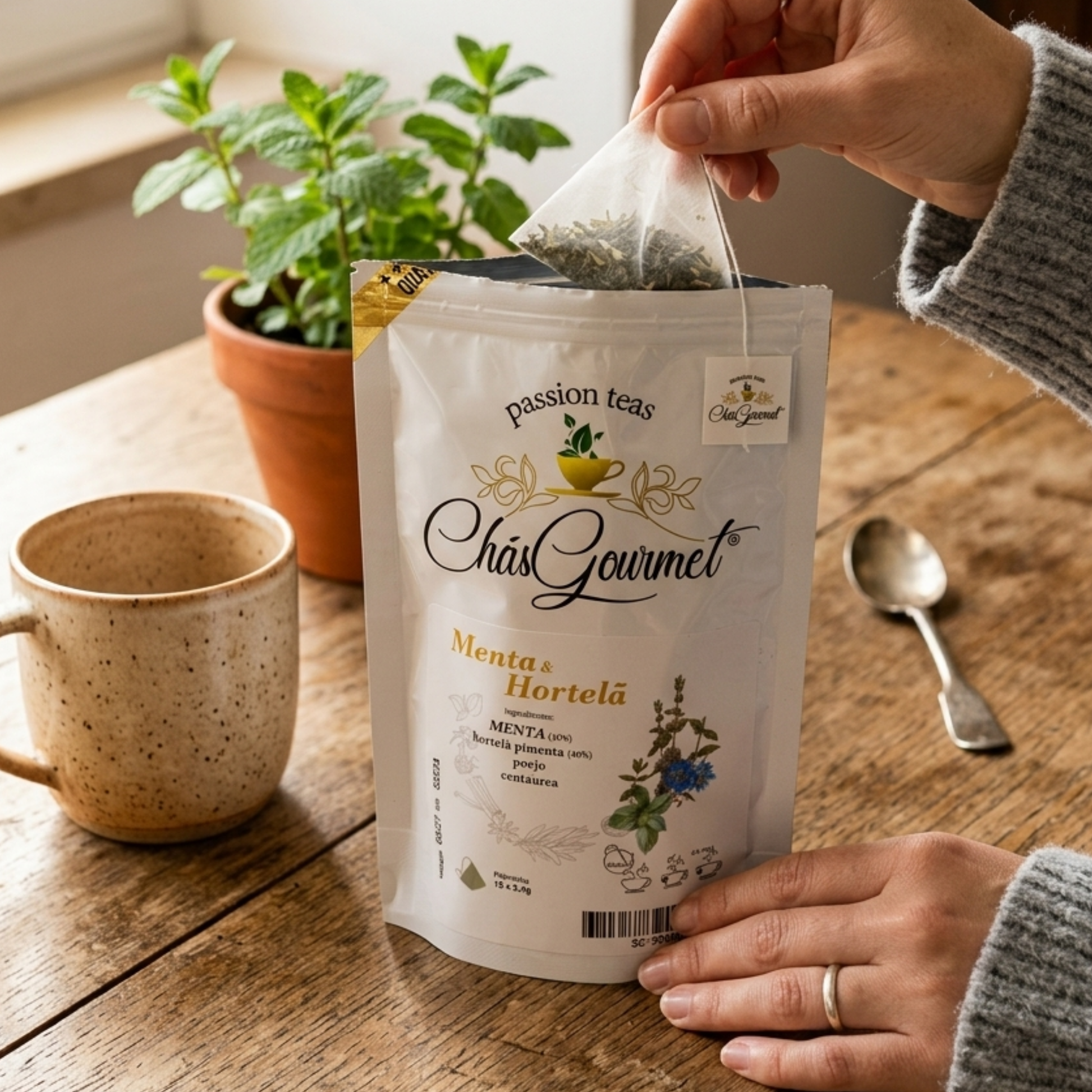 A infusão Menta & Hortelã — anteriormente conhecida como Tisana Atlântico — mantém a mesma combinação equilibrada de plantas frescas.